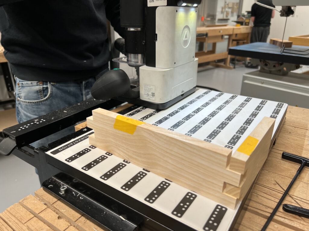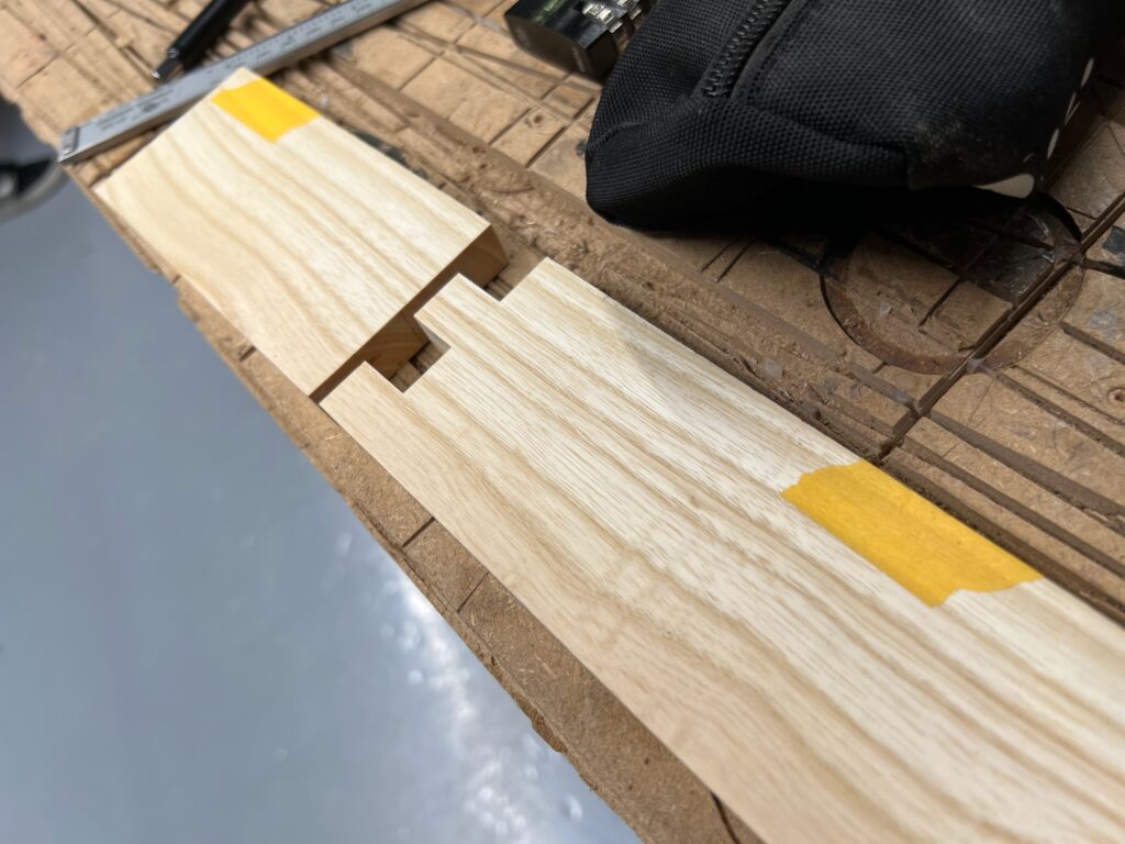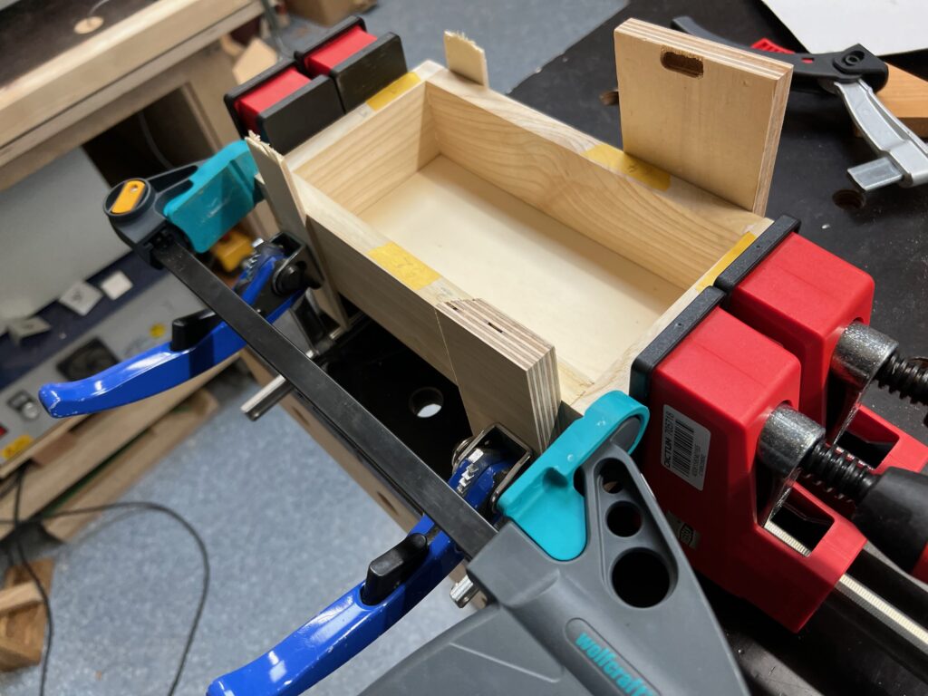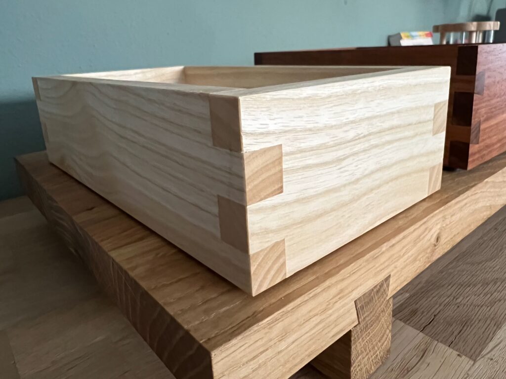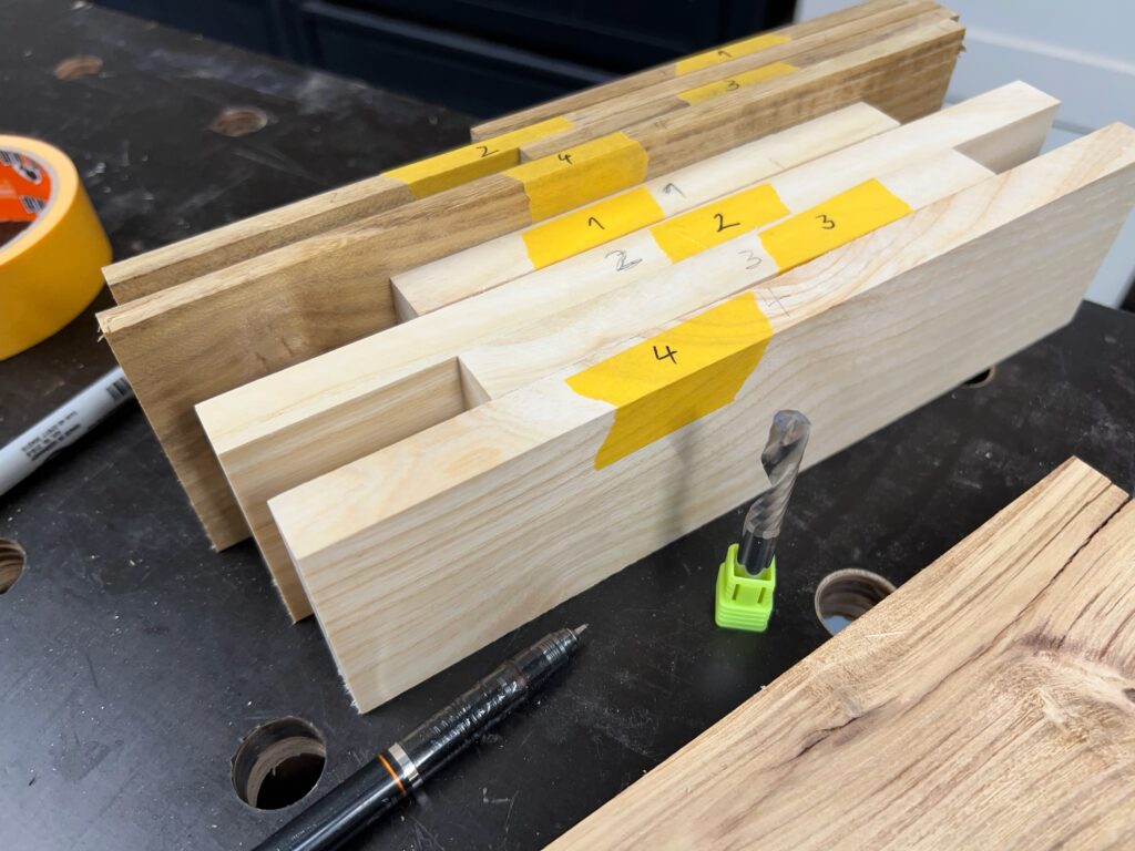 Die Nut und die Griffmulden in den Stirnholzleisten habe ich per CNC gefräst. Damit wären auch sehr ausgefallene Griffe möglich, ich hab’s aber einfach gehalten: Eine Tasche und eine Fase. Die Ecken der Nuten sind dann schon wieder per Stemmeisen ausgestochen.
