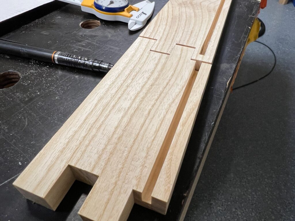 Das exakte Einpassen der Feder in die Nut der Stirnholzleisten habe ich dann aber am Frästisch vorgenommen. Dort kann man problemlos 1/10 mm mehr oder weniger abfräsen und sehr wiederholgenau arbeiten.