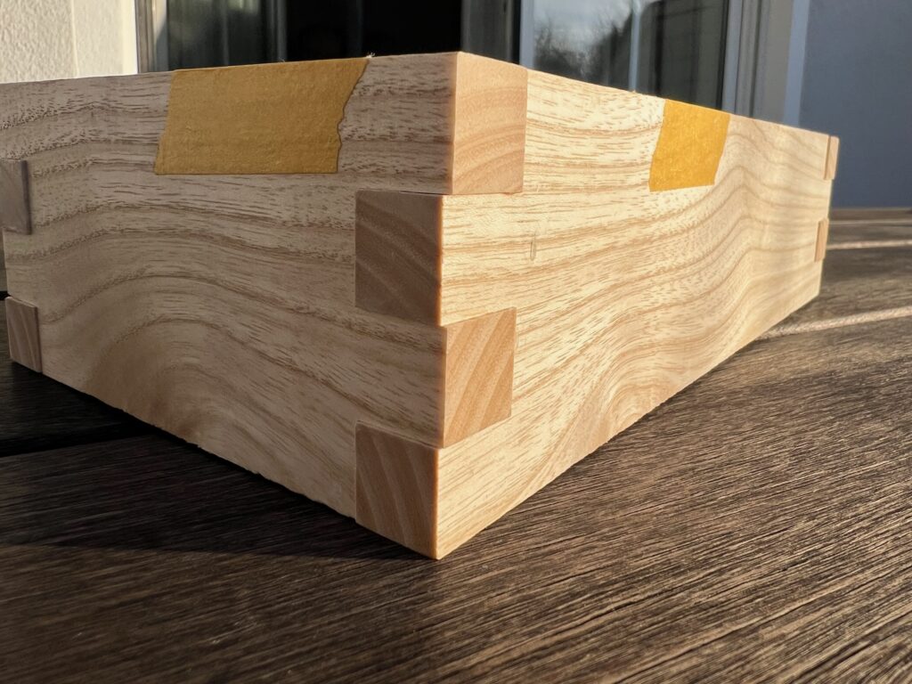 Die Federn am Schneidebrett habe ich per Tauchsäge ein paar mal eingeschnitten, die groben Reste mit dem Hammer abgeklopft und per Stemmeisen und Handhobel versäubert.