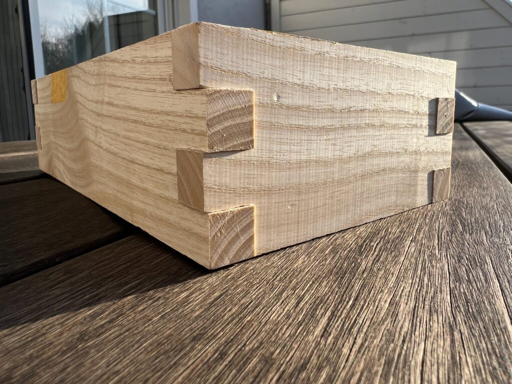 Die passenden Dübel zum fixieren der Stirnholzleisten habe ich aus 6×6 mm Kanthölzern gefräst. Auch diese sind aus dem gleichen Holz wie das Brett selbst: Alles vom selben Baum aus dem nahegelegenen Altmühltal.